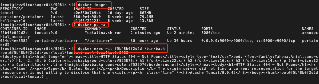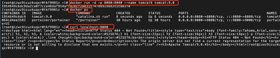 下载并启动完后,我们查看镜像发现确实多了个tomcat9.0,这时候由于我们没有配置端口映射,直接访问localhost:8080是在宿主机上访问的,肯定访问不到,所以我们得进入容器内访问,发现访问报404,所以服务实际上启动了的,至于为啥404我们后面再分析;