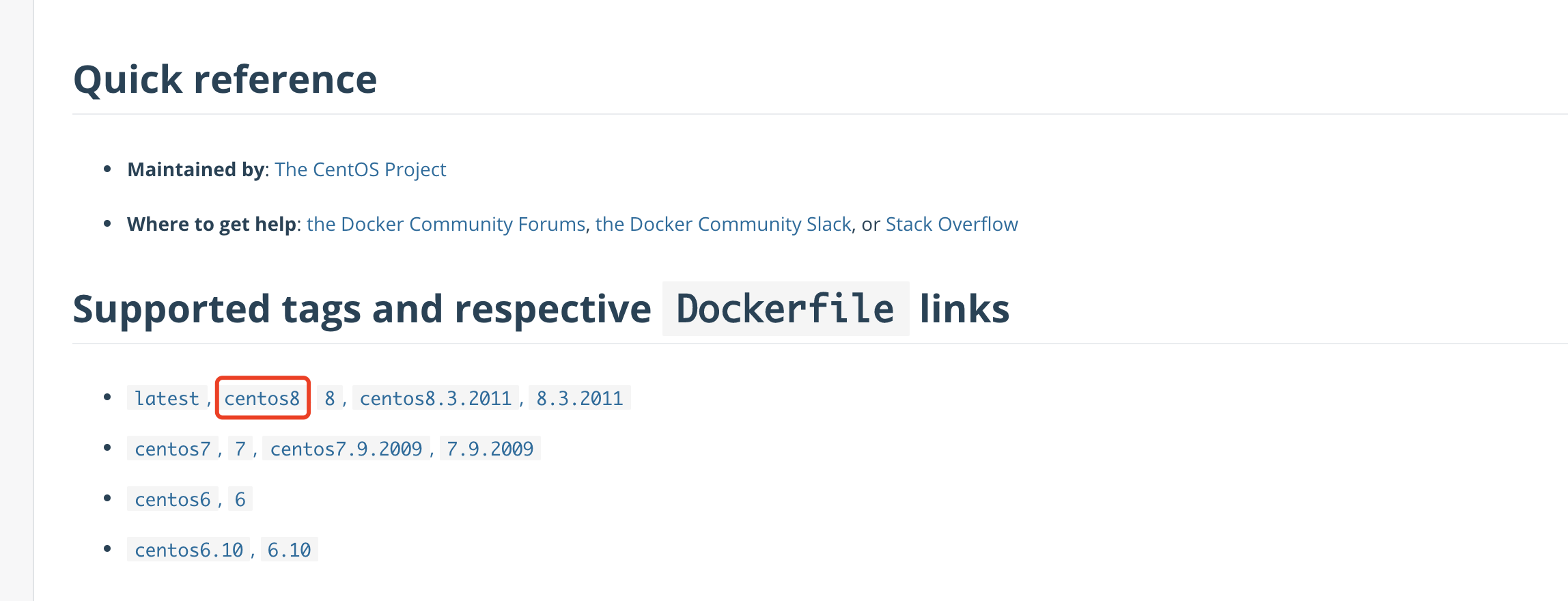 例如我们去dockerhub上搜索centos,我这里安装的是centos8的版本,所以去看看8下面都有啥吧;