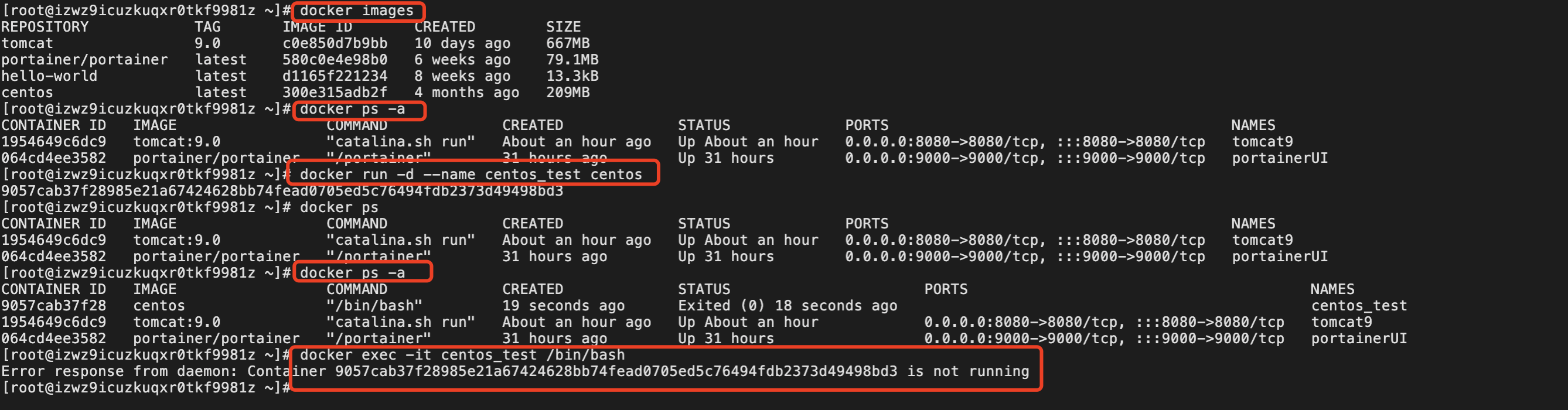 我们使用下载的centos镜像,运行进入容器发现容器没有运行,docker ps查看运行中的容器,docker ps -a查看所有容器;因为我们下载的centos里面啥都没有,没有做任何事情docker默认不启动;