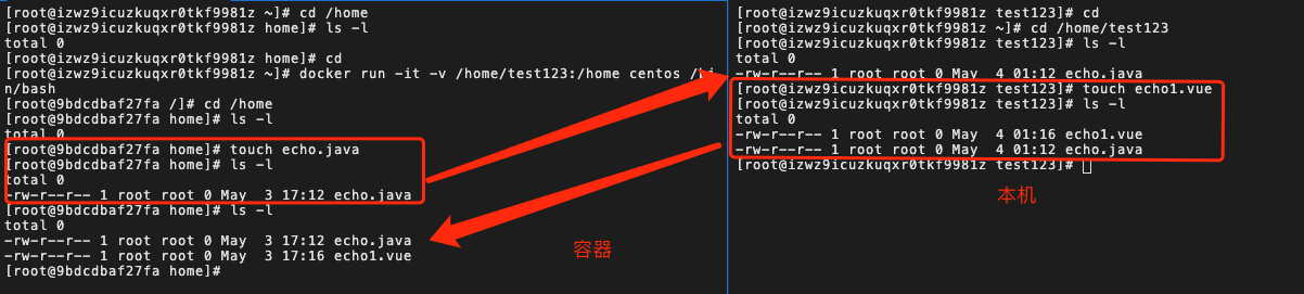 我们先看下主机/homr目录下是否是空的.可以看到容器和主机间通过挂载是可以实现双向同步;