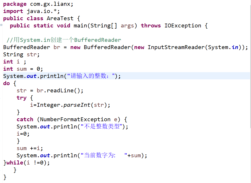 上面的程序如何不是输入整数就把sum打印成0,需要输入整数,才会执行正确。否则会打印异常里的输出。