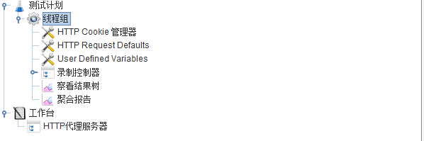2.在线程组下添加录制控制器,用来记录在Jmeter代理录制下的所有模仿浏览器产生的对服务器的请求,同时添加其它组件,如查看结果树、聚合报告、HTTP cookie管理器;