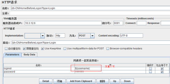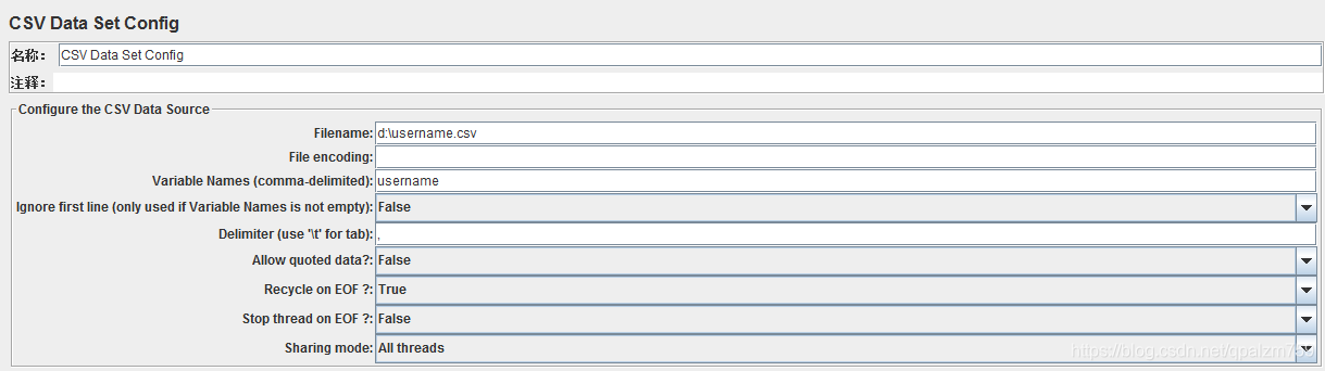 6.点击CSV Data Set Config配置其参数:Varisable Names代表文件d:\username.csv的变量配置,第一列是loginid,第二列是password。这里我们直接读取本地CSV文件中的用户数据。