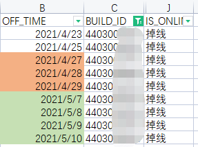 如果掉线天数与最大掉线天数相同,则这几天是最长连续离线日期范围(当然还可以求最近多少天内掉线情况、连续掉线最长时间段等,根据需要增加过滤条件)