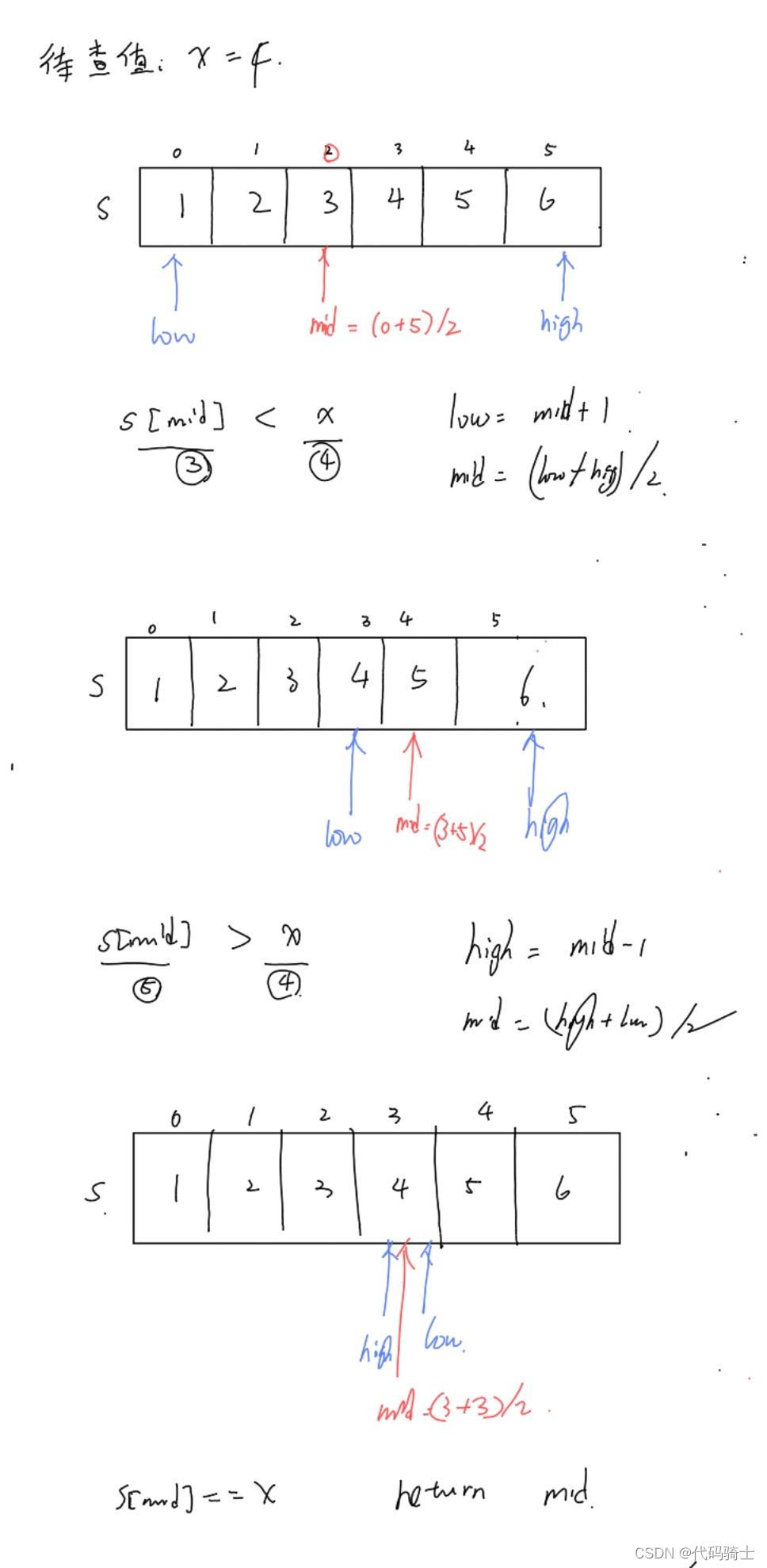 (2)判定关系若low<=high,则判断x和s[mid]的大小关系,如果x>s[mid],low = mid+1,更新中间值mid = (low+high)/2;如果x<s[mid],high=mid-1,更新中间值mid = (low+high)/2。若果x==s[mid],返回mid就是x的位置。