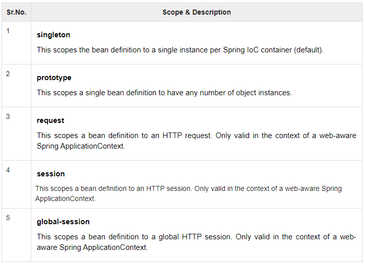 上图为各个scope描述的官方文档截图。Spring在一开始的时候只提供了singleton和prototype两种bean scope.