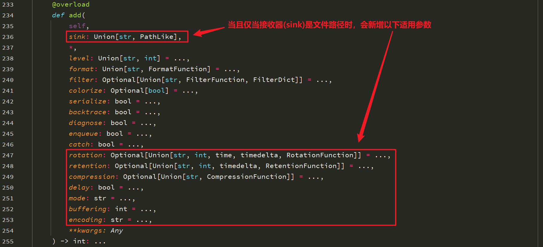 loguru模块源码中add()方法的参数如下: