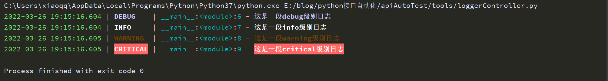 从结果中可以看出来,输出内容中模块部分显示的是如__main__:<module>:20的形式,而并不是我们想要看到的对应的模块名称,这是因为直接执运行了当前文件的文件,如果是其他模块调用执行便会显示对应的模块名称。