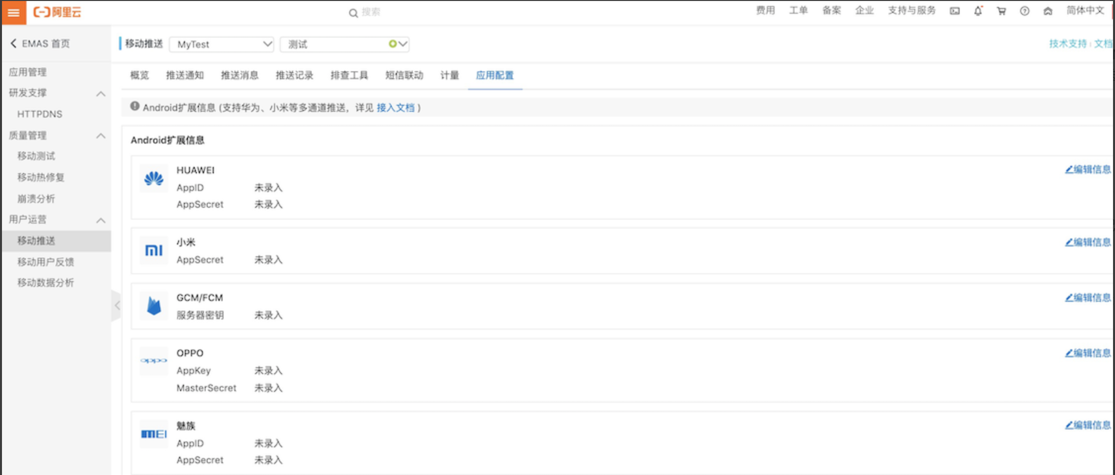 3、在阿里云移动推送配置渠道平台的信息,如下图: