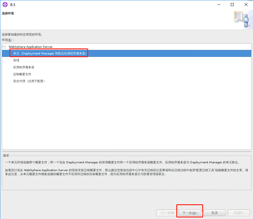 - 选择“单元...”,然后点击“下一步”(这里不选择默认的应用程序服务器是因为默认的“应用程序服务器”只有服务器的功能,没有控制台的功能)