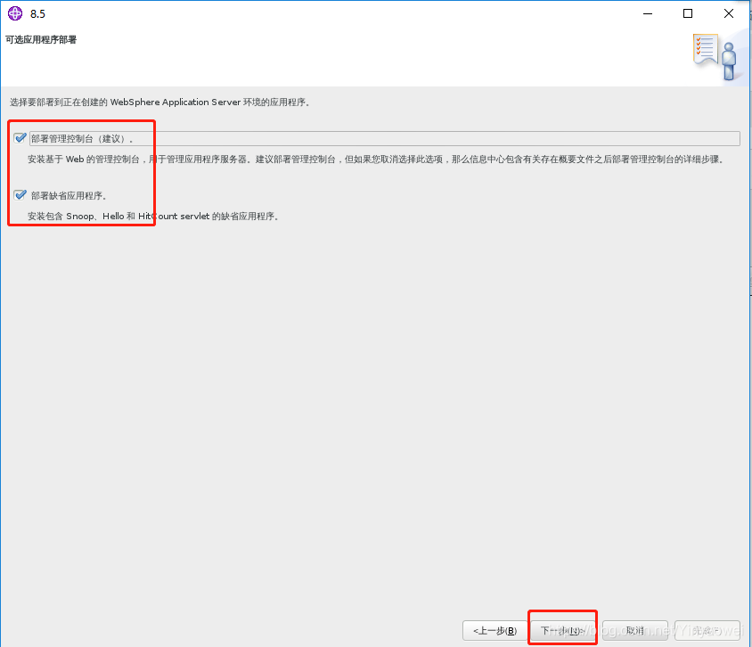 - 勾选“部署管理控制台”和“部署缺省应用程序”,然后点击“下一步”