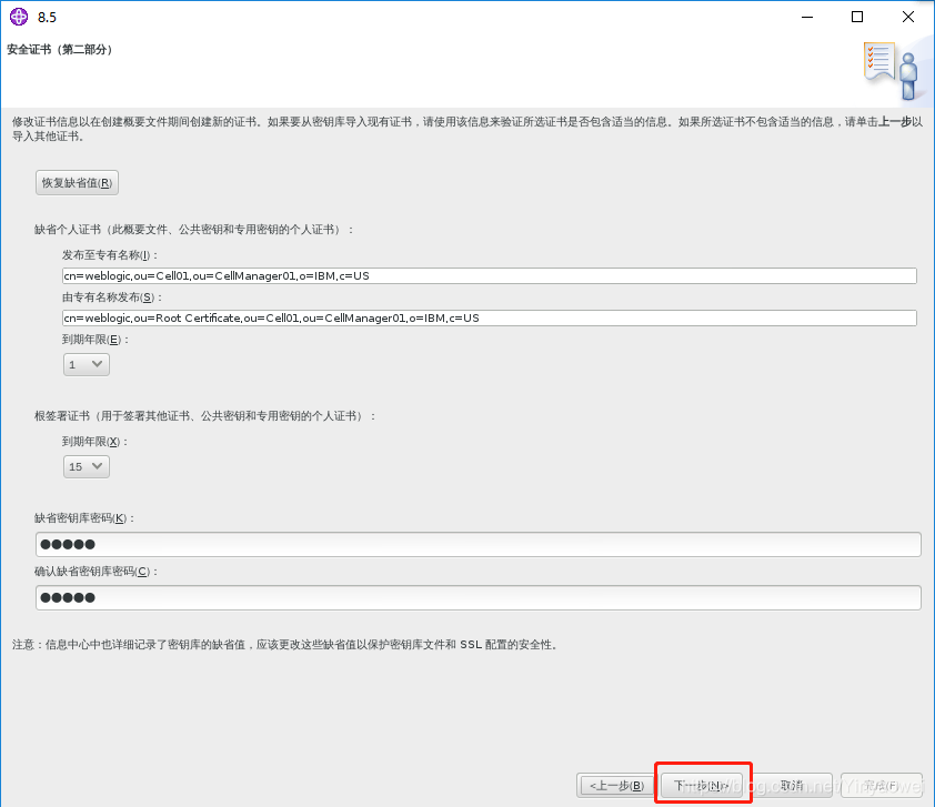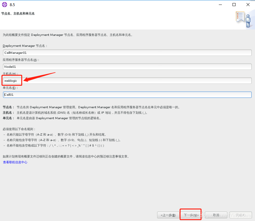 - 主机名一定要填写能够ping通本服务器的主机名(本人使用的服务器主机名为“weblogic”),否则后面启动服务时就会失败,其他信息可调整也可不调整,配置完后点击“下一步”