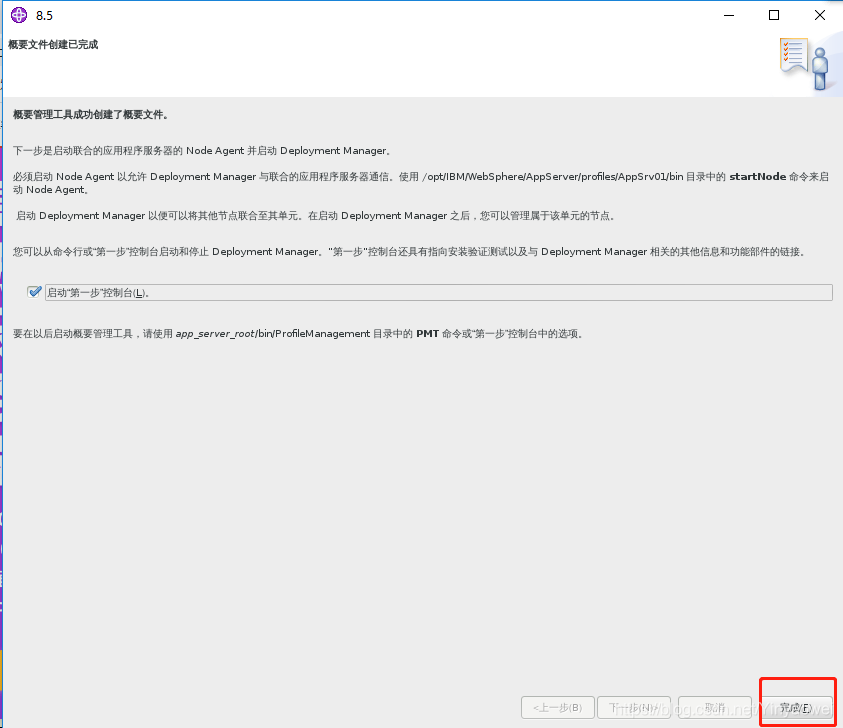 - 点击“完成”按钮即可(此处勾选了“启动...控制台”,所以在点击“完成”按钮后,WebSphere控制台就开始启动了)