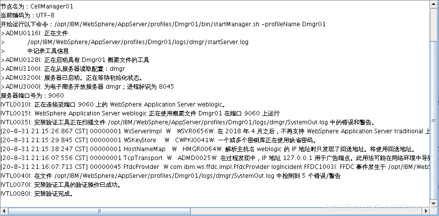 - 由root用户切换到其他用户,然后进入到“/opt/IBM/WebSphere/AppServer/profiles/Dmgr01/bin”目录下,然后输入“./startManager.sh”即可启动控制台,耐心等待,如果出现如下图所示内容则表示控制台启动成功: