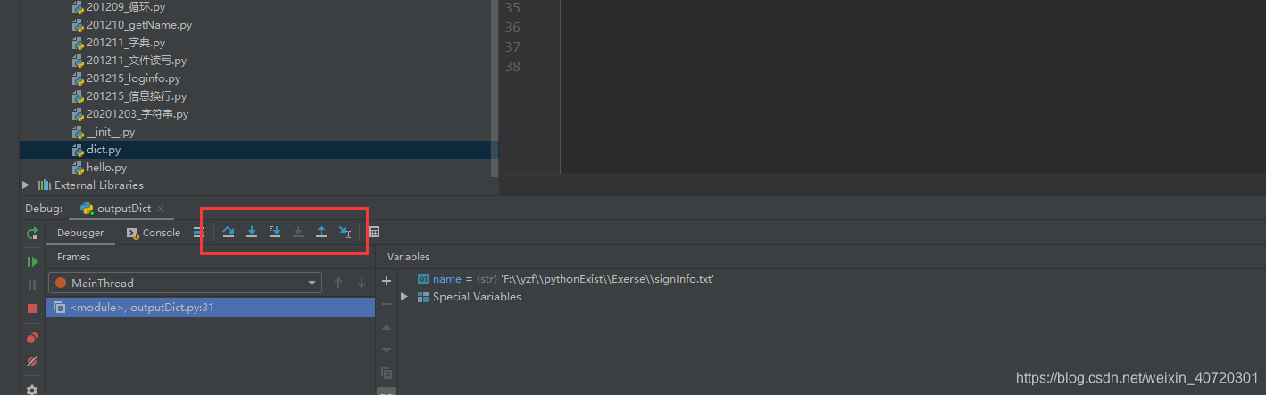 红框从左到右:单步调试,跳入(内部函数),跳出(内部函数),运行到指定行