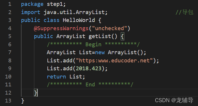 请仔细阅读右侧代码,根据方法内的提示,在Begin - End区域内进行代码补充,创建ArrayList集合并且向集合中添加数据,具体要求如下: