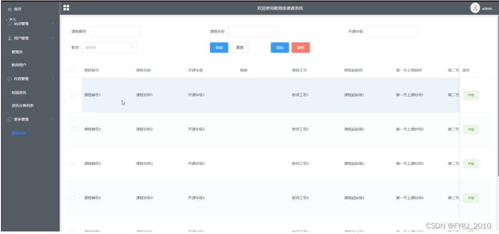 This design mainly realizes the teacher course scheduling system with the advantages of humanization, high efficiency and convenience, and completes the functional modules such as user management, campus information, information classification list, course information and so on. The system communicates with the server through the browser to realize the interaction and change of data. You can operate the system and realize data communication management by moving your fingers through a computer. The safety, stability and reliability of data are fully considered in the design process of the whole system, and the operation process is simple. Through scientific management and convenient service, the system improves work efficiency and reduces errors and omissions in data storage.