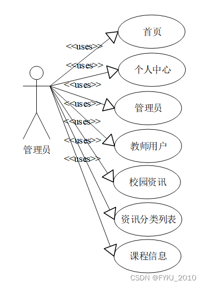 系统设计的目的是分析系统包括的所有功能结构,为开发人员设计开发和实现系统做好准备工作。经过前期的需求调查、分析和整理之后,确定的总体需求主要包括多个模块,分别是:系统用户管理、公告、校园资讯、资讯分类列表、课程信息。系统整体角色分为两个部分,教师和管理员。权限分布也是很明显,教师用户是在除去浏览信息之外还具有查询和管理自己账户信息、公告消息、校园资讯、课程信息等权限;管理员是最高权限拥有者。