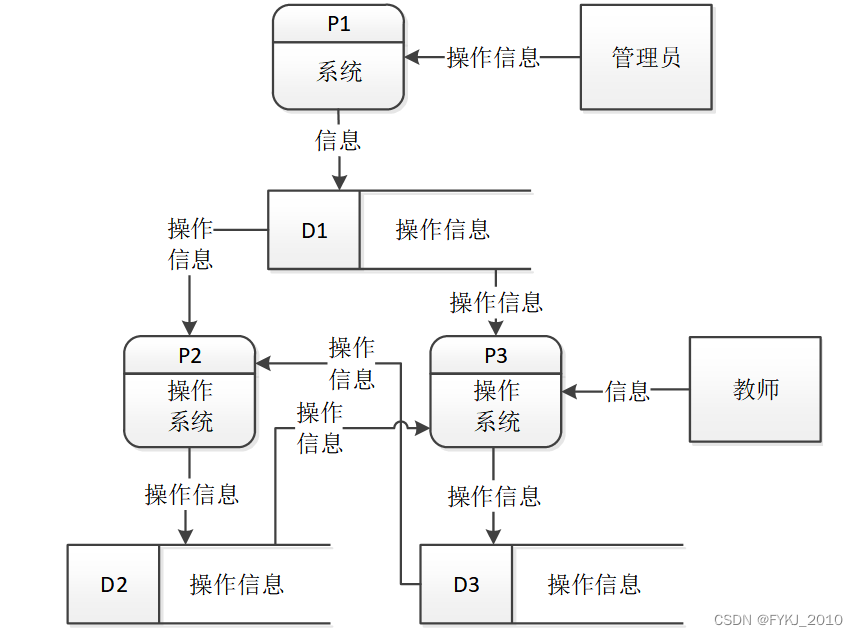 二层数据流程是对一层数据流层图中填写登录信息、用户功能的细化。即:填写登录信息细化为填制信息、后台审核,用户功能细化为教师资料修改、课程信息表操作。