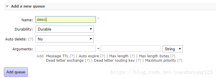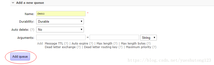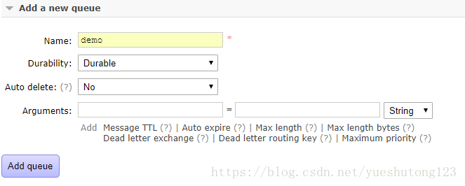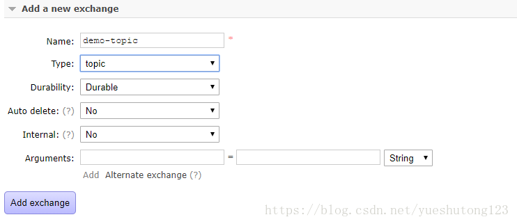 (1).我们在RabbitMQ后台新建一个交换机,demo-direct交换机名,direct交换机类型,Durable持久化: