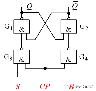 如下图所示,将基本RS锁存器的输入端分别经过一个与非门作为钟控信号。就变成了同步RS锁存器。