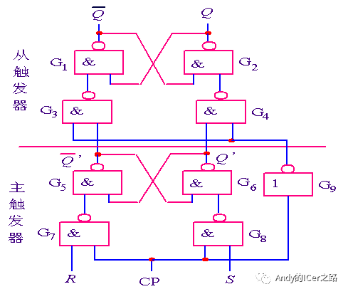 (1)当CP=1时,CP’=0,从触发器被封锁,保持原状态不变:主触发器工作,接收R和S端的输入信号。