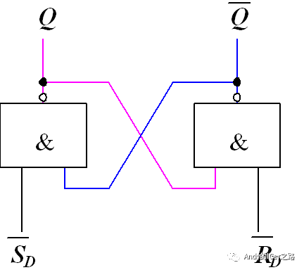 最简单的触发器是基本RS触发器,基本RS锁存器可以由两个与非门构成,电路如下: