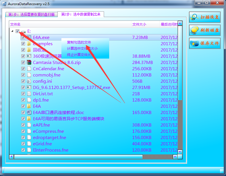 步骤4:将想要恢复的文件打钩,然后点右上角的保存,《文件保存》按钮,将打钩的文件拷贝出来。