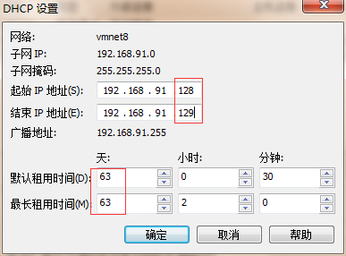 3.更改IP地址,起始IP不变,只更改结束IP地址(如改为129,则固定了128一个IP;如改为130,则固定了128,129两个Ip),这样就达到了固定IP;然后更改租用时间(最大63天),再确定
