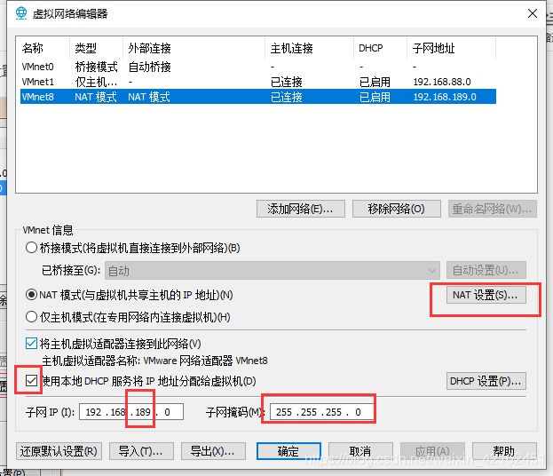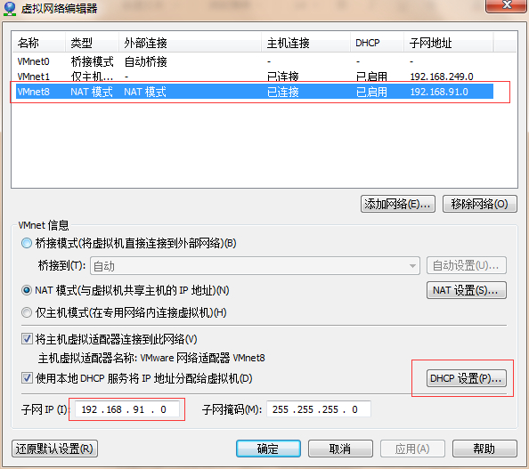 2.选择NAT模式,注意子网IP(特别是网段,不能更改,如更改后,要点击还原默认设置),点击DHCP设置