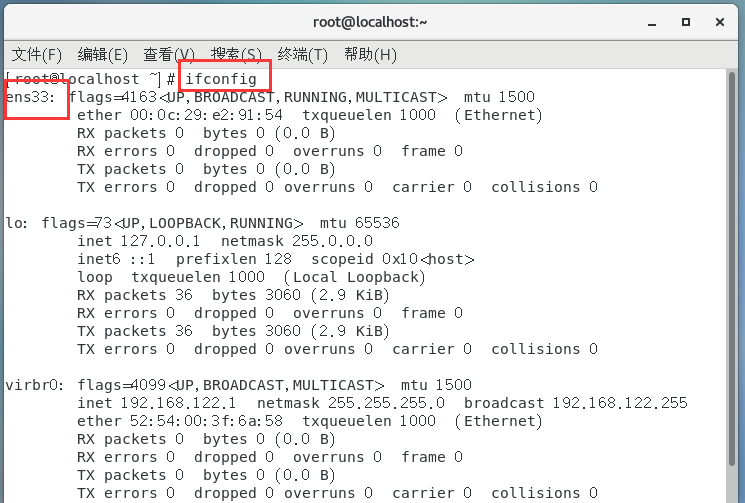 5、进入虚拟机后,先使用ifconfig查看网卡名称
