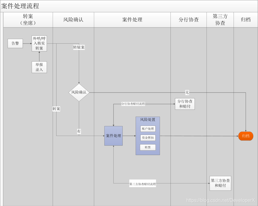 从上图可以看到,报警和案件信息的流转审批要经过多个环节,包括报警信息核实转案、风险确认、案件处理、分行和第三方协查、赔付处理、归档存储。