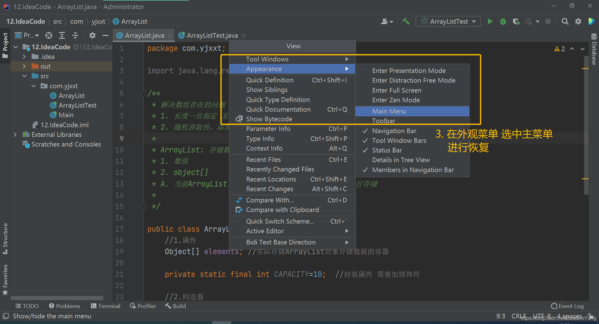 3.在外观菜单中 勾选主菜单 进行恢复 即:View->Appearance->Main menu 和 Toolbar