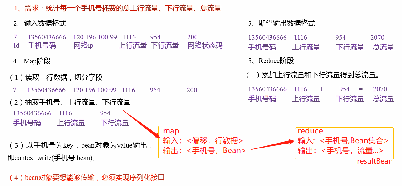需求:统计每一个手机号耗费的总上行流量、下行流量、总流量,数据如下: