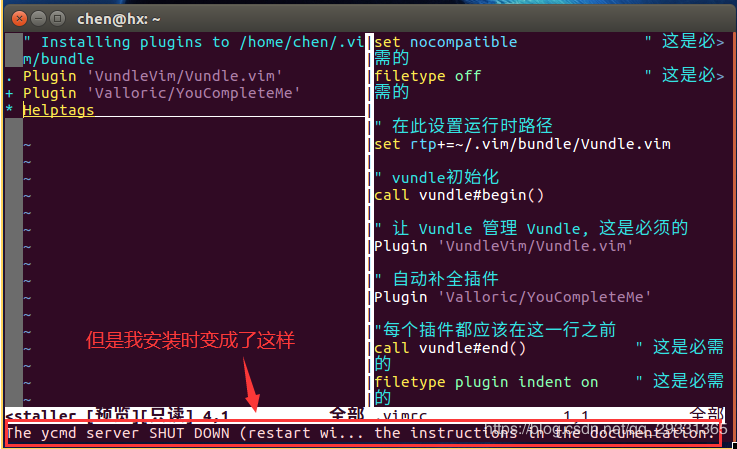 然后使用了一下 vim,发现报了下面这个错误:The ycmd server SHUT DOWN ...