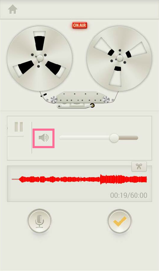 A:在录音界面下,点击左下方的“麦克风”按钮,按钮红灯亮,则为人声录制期间;再次点击“麦克风”按钮,按钮灯灭,则停止录入人声。在有背景音乐播放的同时,音轨会有波形条进程的显示,但只有当“麦克风”按钮红灯亮起,才是把人声也录入的标识;否则则为背景音乐的录入。