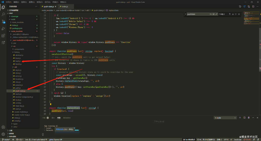 我在测试hash路由切换的时候,看会不会触发window.addEventListener('hashchange',()=>{}),奇怪的事情发生了,它没有触发,却触发了自定义window.addEventListener('replacestate',()=>{}和window.addEventListener('pushstate',()=>{})等History API,究竟是为什么?我明明把它设置为hash路由了,为什么还会触发History API?带着这个疑问,我忍不住的去看了vue-router的源码,最后,解开了自己的疑问,看下面: