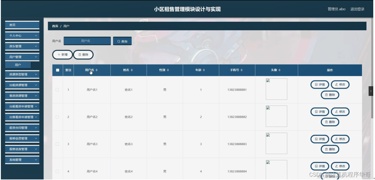 用户管理,在用户管理页面可以对索引、用户名、姓名、性别、年龄、手机号、头像等内容进行详情,修改和删除操作,如图5-8所示。