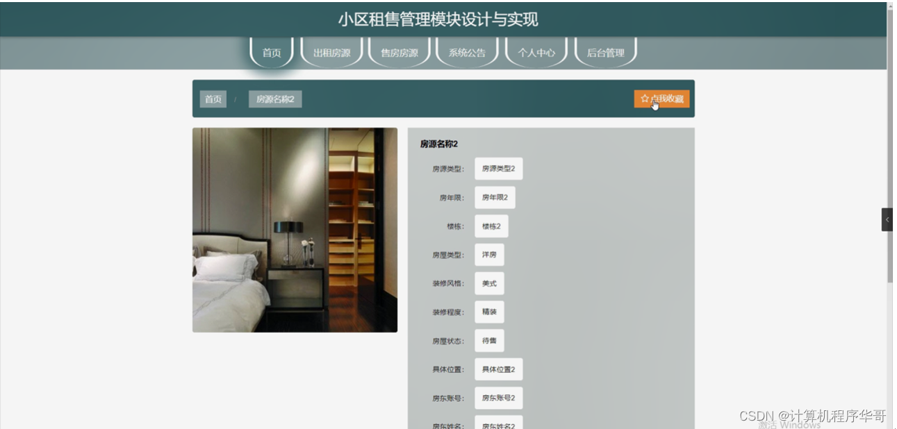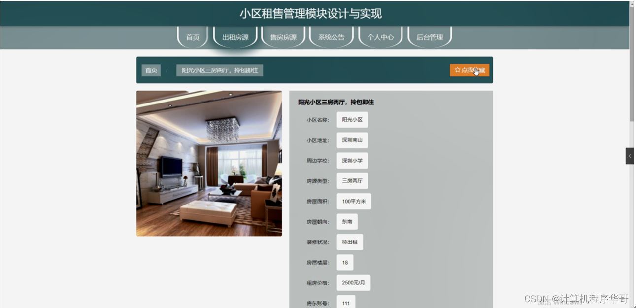 出租房源,在出租房源页面可以查看房源标题、小区名称、简介图片、小区地址、周边学校、房源类型、房屋面积、房屋朝向、装修状况、房屋楼层、租房价格、房东账号、房东姓名、房东手机、点击次数、房间设施等详细内容,并进行看房申请,评论或收藏操作,如图5-2所示。