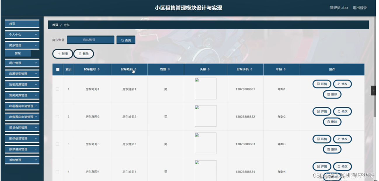 房东管理,在房东管理页面可以对索引、房东账号、房东姓名、性别、头像、房东手机、年龄等内容进行详情,修改和删除操作,如图5-7所示。