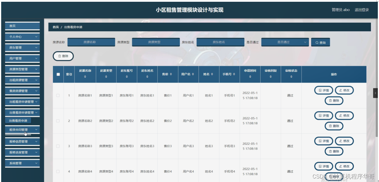 出售看房申请管理,在出售看房申请管理页面可以对索引、房源名称、房源类型、房东账号、房东姓名、售价、用户名、姓名、手机号、申请时间、审核回复、审核状态等内容进行详情,修改和删除操作,如图5-11所示。