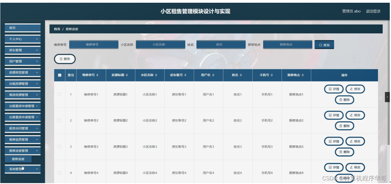 报修进度管理,在报修进度管理页面可以对索引、维修单号、房源标题、小区名称、房东账号、用户名、姓名、手机号、报修地点等内容进行详情,修改和删除操作,如图5-12所示。