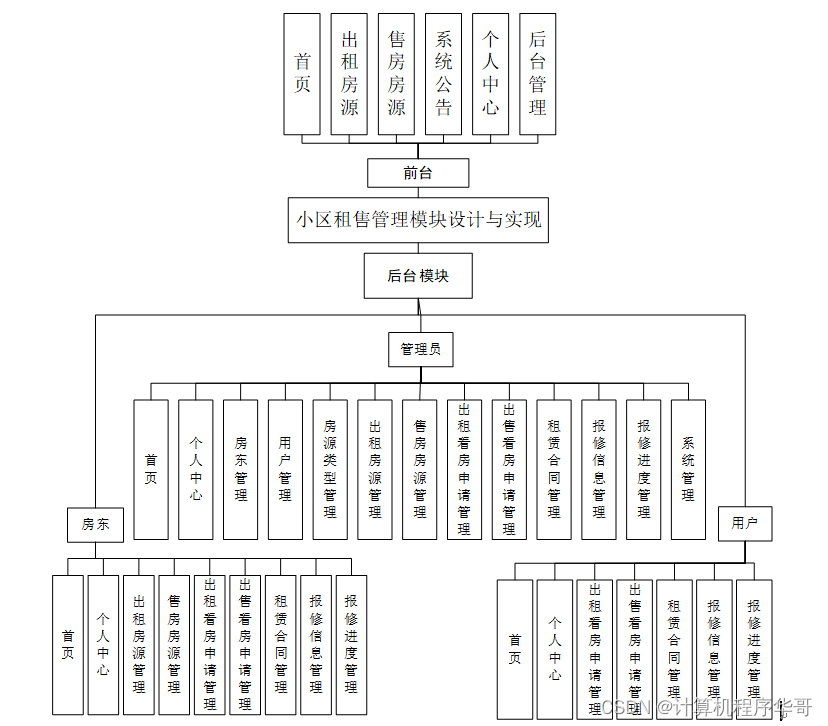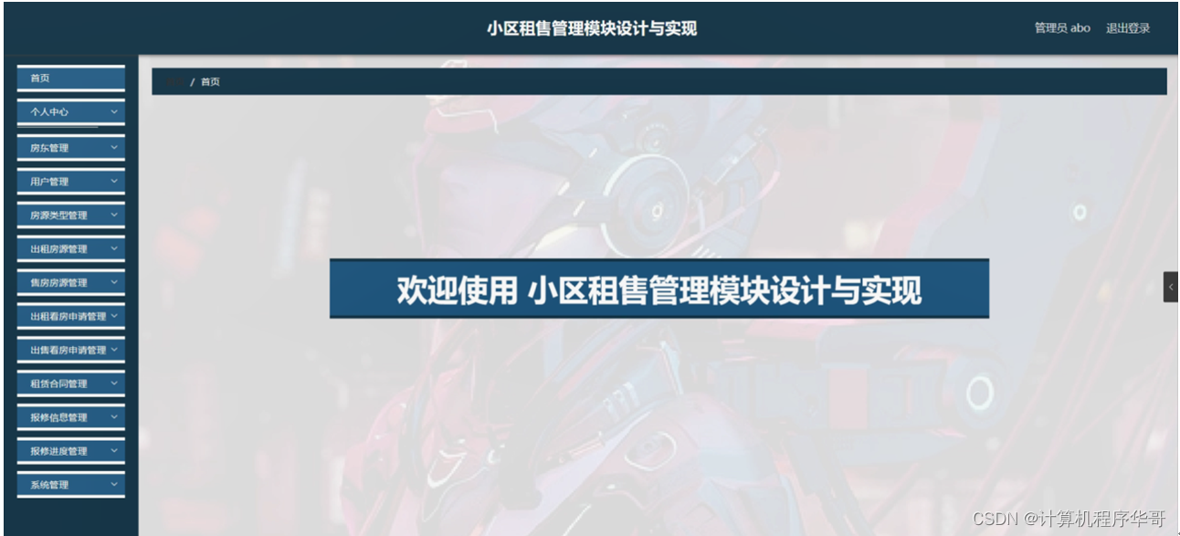 管理员登录系统后,可以对首页、个人中心、房东管理、用户管理、房源类型管理、出租房源管理、售房房源管理、出租看房申请管理、出售看房申请管理、租赁合同管理、报修信息管理、报修进度管理、系统管理等功能进行相应的操作管理,如图5-6所示。