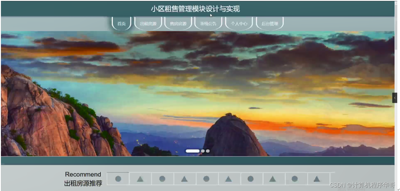小区租售管理系统,在系统首页可以查看首页、出租房源、售房房源、系统公告、个人中心、后台管理等内容进行详细操作,如图5-1所示。
