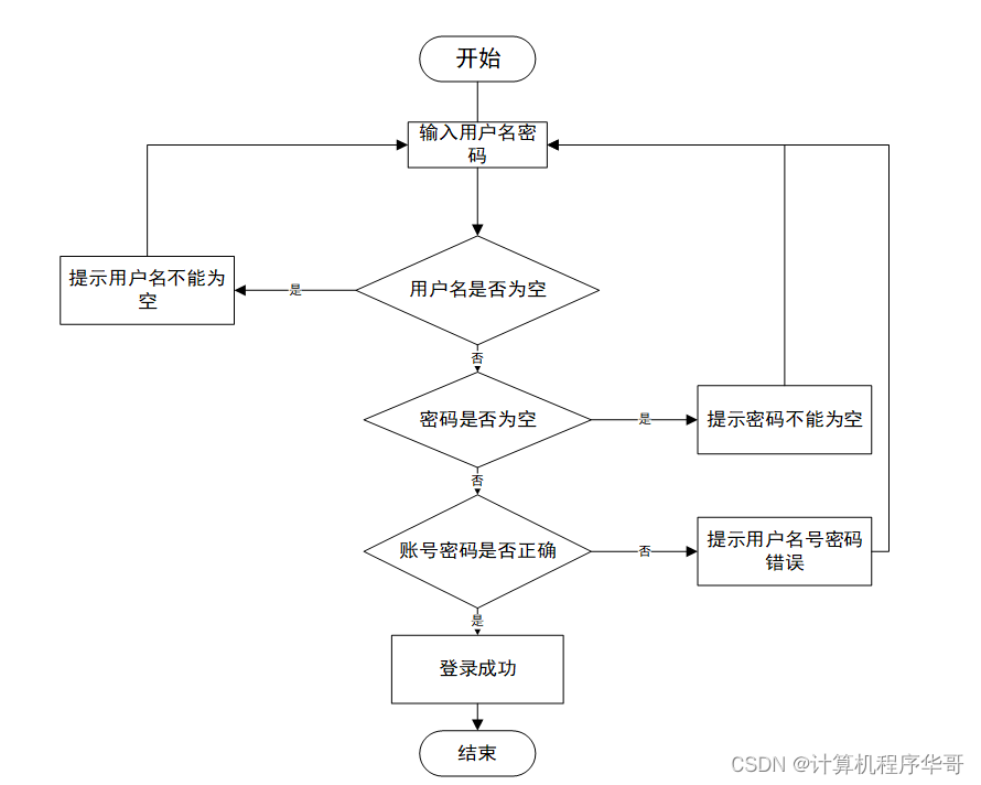 运行流程主要为输入用户名密码,并且不能为空,若为空则提示不能为空,用户名和密码全部输对即可登入成功,主要流程如图3-2。