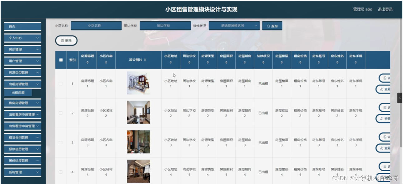 出租房源管理,在出租房源管理页面可以对索引、房源标题、小区名称、简介图片、小区地址、周边学校、房源类型、房屋面积、房屋朝向、装修状况、房屋楼层、租房价格、房东账号、房东姓名、房东手机等内容进行详情,修改,查看评论或删除操作,如图5-9所示。