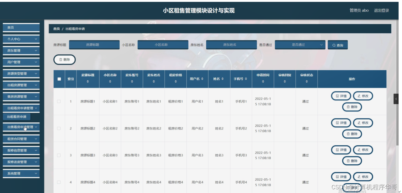 出租看房申请管理,在出租看房申请管理页面可以对索引、房源标题、小区名称、房东账号、房东姓名、租房价格、用户名、姓名、手机、申请时间、审核回复、审核状态等内容进行详情,修改和删除操作,如图5-10所示。