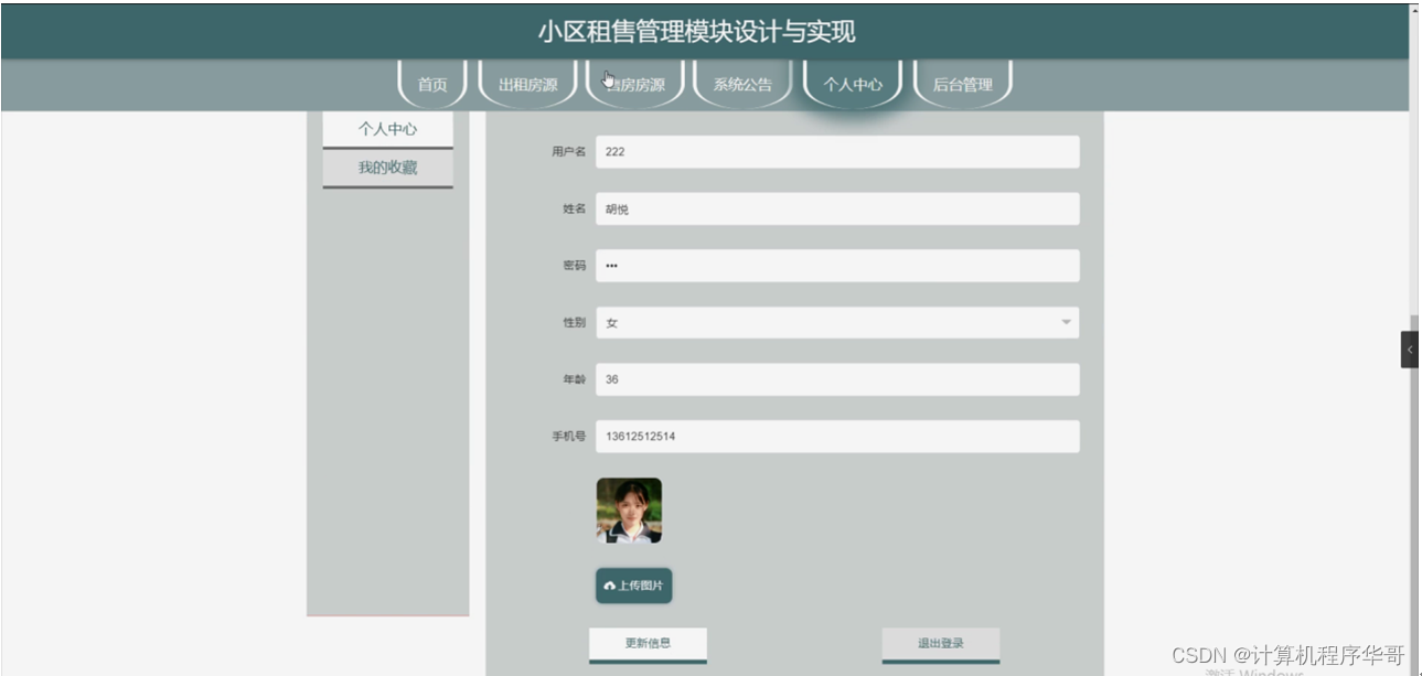 个人中心,用户在个人中心页面通过填写用户名、姓名、密码、性别、年龄、手机号、上传图片等内容进行更新信息,还可以根据需要对我的收藏进行详细操作,房东也可以执行同样的操作;如图5-4所示。
