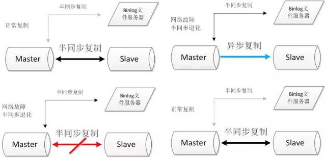 半同步复制由于发生超时后,复制断开,当再次建立起复制时,同时建立两条通道,其中一条半同步复制通道从当前位置开始复制,保证从机知道当前主机执行的进度。另外一条异步复制通道开始追补从机落后的数据。当异步复制通道追赶到半同步复制的起始位置时,恢复半同步复制。