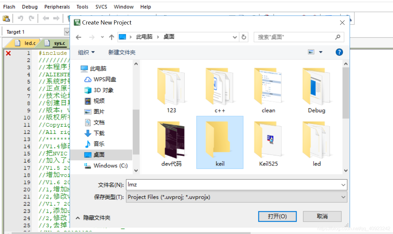 (2) 然后我们打开keil开始创建工程,在工具栏下选择project->new vision project.然后出现这个界面,接着我们鼠标左键双击打开我们刚刚在桌面建好的名叫keil的文件夹,将我们的工程命名为lmz.然后点击打开